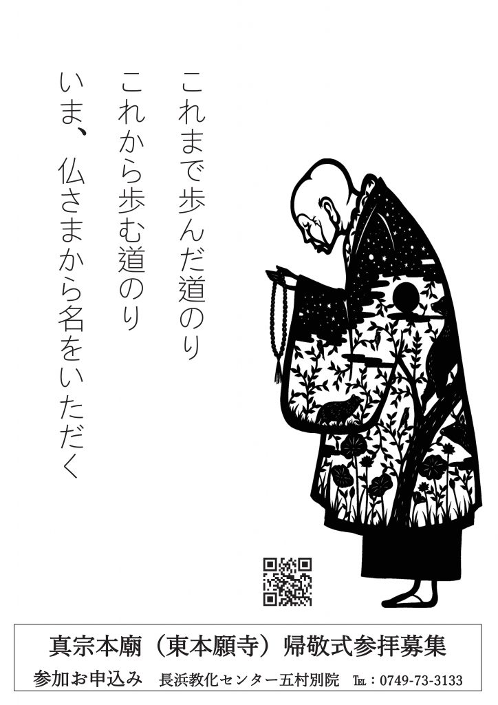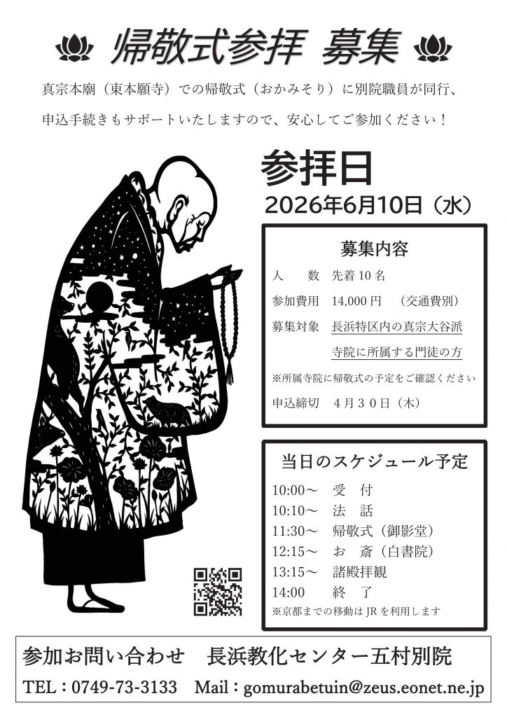 真宗本廟(東本願寺)での帰敬式(おかみそり)に別院職員が同行し、申込手続きもサポートいたしますので、安心してご参加ください。募集対象は長浜特区内の真宗大谷派寺院に所属する門徒の方です。詳しくはチラシをご覧ください。